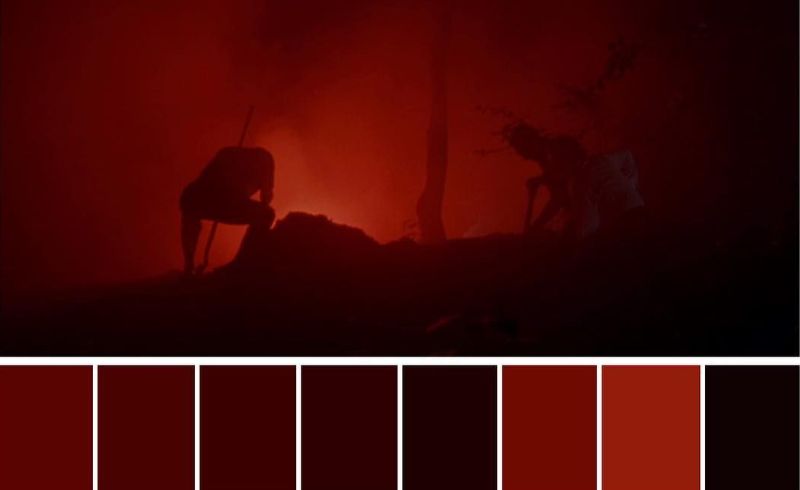 Nesse sentido, uma paleta de cores engloba tons emocionais bem específicos, tendo uma função na narrativa. Não é apenas sobre como determinadas cores e suas variações se destacam, mas porque se destacam. A cena avermelhada da imagem acima, por exemplo, mostra um grupo de mafiosos enterrando um corpo, gerando a sensação de que eles estão em um ambiente infernal enquanto realizam uma tarefa maligna.