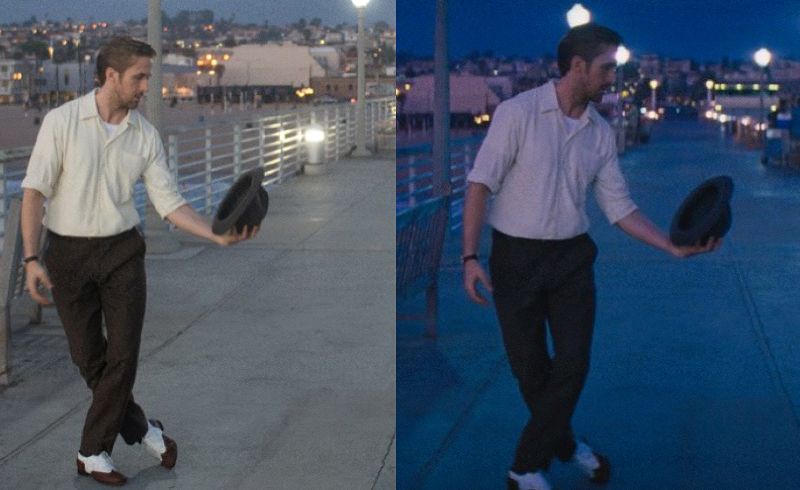Comparação do momento real de filmagem e o resultado final em La La Land